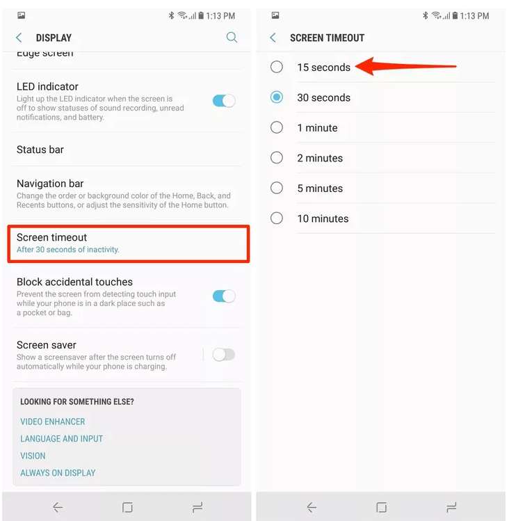 Se vuoi davvero risparmiare ogni piccola energia sul tuo telefono Samsung, devi ridurre il timeout dello schermo. Questo è assolutamente un buon senso: quando non si utilizza attivamente il telefono, è meglio tenere lo schermo spento.