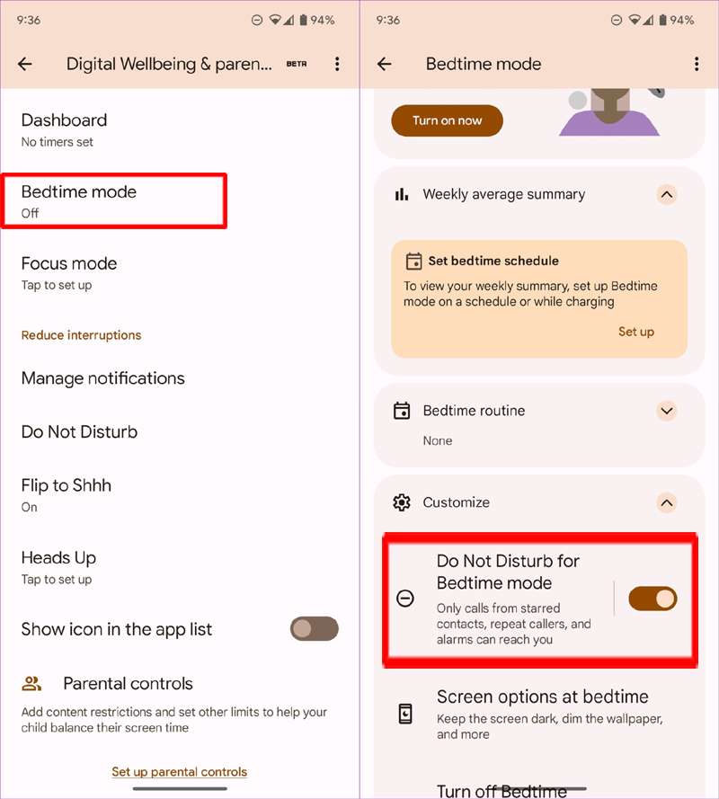 - Tocca Modalità ora di andare a letto, quindi tocca Personalizza menu per espandere.