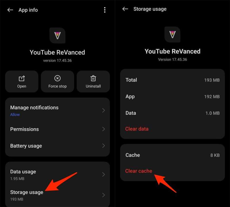 Su Android, vai su Impostazioni > App > Gestione app > YouTube ReVanced > Utilizzo spazio di archiviazione > tocca Cancella cache.