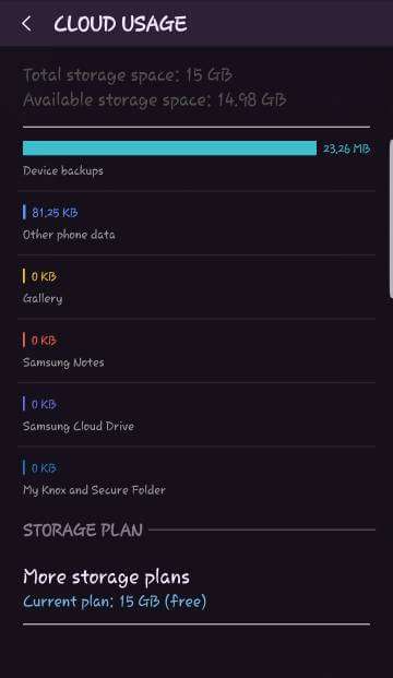 Ho bisogno di aiuto! Ho un modello sbloccato S9 plus. Ogni mattina mi sveglio con un messaggio di errore dal cloud Samsung che dice che il cloud non è riuscito a eseguire il backup a causa della mancanza di spazio di archiviazione! Come puoi vedere dalla mia foto, ho un sacco di spazio di archiviazione 14,98 disponibile su 15G.