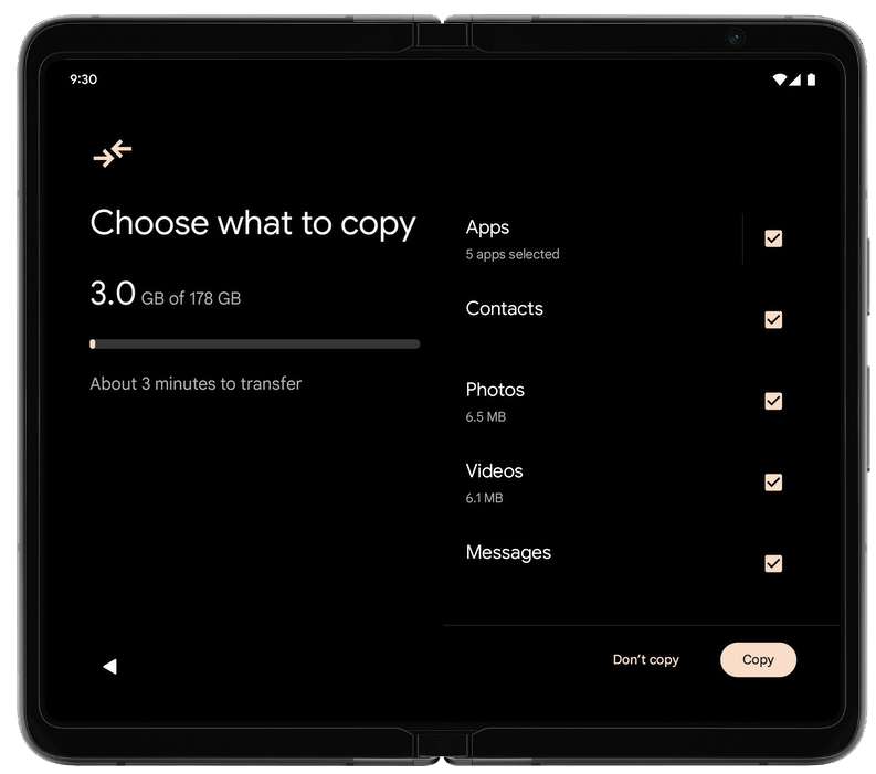 Sul tuo Pixel Fold, scegli i tipi di dati che desideri trasferire. Una volta che sei pronto, tocca “Copia”.