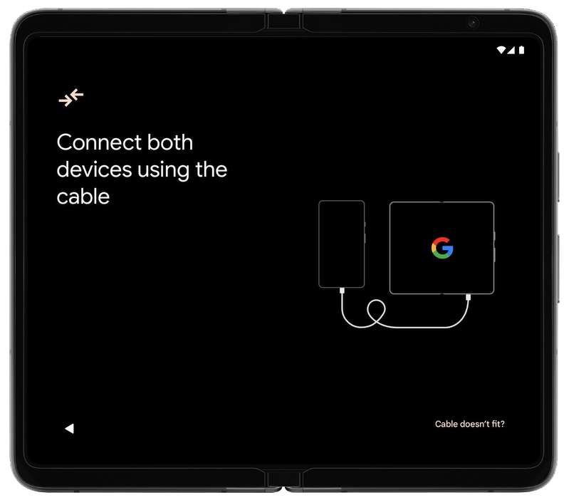 Ora collega l’altra estremità del cavo al tuo Pixel Fold. Se il cavo non entra nel tuo Pixel Fold, utilizza l’adattatore per il trasferimento rapido fornito con Pixel Fold. Una volta che i dispositivi sono collegati, tocca “Avanti”.