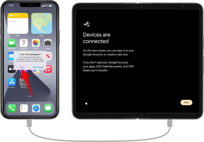 Sul tuo iPhone, se viene visualizzato “Fidati Questo Computer”, quindi tocca “Trust”. Una volta che i dispositivi sono collegati, tocca “Avanti”.